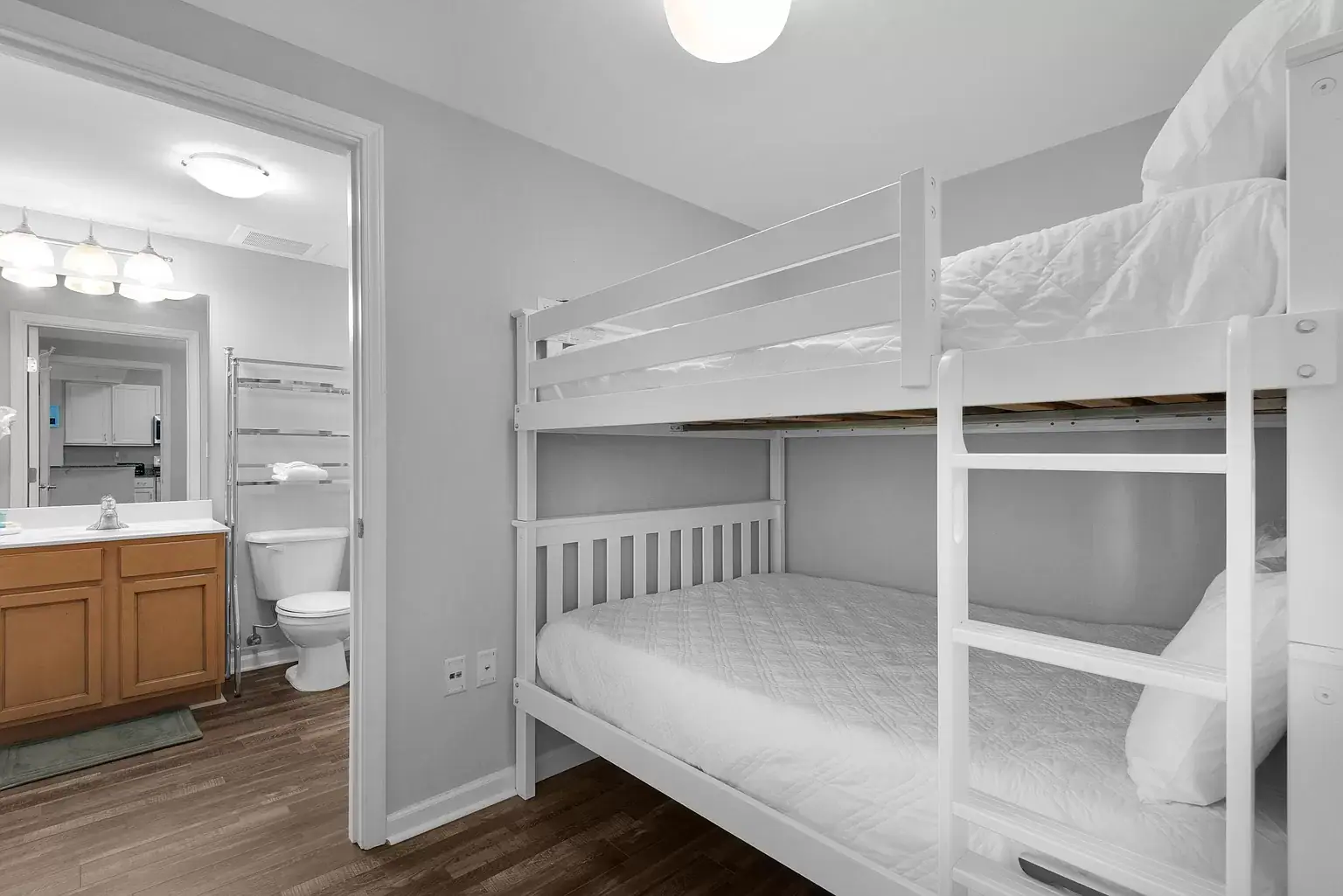 Palms Resort #11008 is a Junior 2BR/2BA, which is a 2 bedroom with a full-sized master plus a smaller bedroom and two full sized bathrooms, one with a walk-in shower. The master has a king-sized bed. The second bedroom has a full over full bunk bed, with its own bathroom entry. There is also a sofa sleeper in the living room, allowing for a maximum of 6 guests!